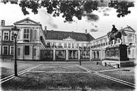 Black & White uitvoering van het Paleis Noordeinde. Het is nog rustig, zonder verkeer en mensen.