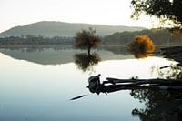 Zwart & wit reflectie door tegenlicht met enkel een struik met herfstkleuren in het meer. Het meer Embalse de Cubillas ligt net vlak boven de stad Granada in Spanje.