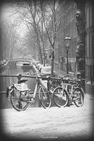 Black & White wintersfeer uitvoering van Amsterdam. Het sneeuwt er heerst een gedempte seréne sfeer rond de grachten. Oude uitvoering van een modern plaatje.