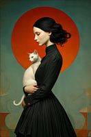 Een portret in neo-klassieke stijl toont een jonge vrouw in een stijlvolle zwarte Victoriaanse jurk tegen een dramatische oranje cirkel. Het contrast tussen de elegante zwarte silhouet en de smetteloos witte kat in de armen creëert een mysterieuze, bijna bovennatuurlijke sfeer. De compositie straalt rust en verfijning uit, terwijl het…