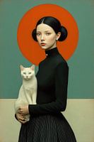 Een portret in hedendaagse esthetiek, waarin een elegante jongev rouw in een zwarte hoogsluitende jurk poseert tegen een turquoise achtergrond met een opvallende oranje cirkel. Het klassieke kapsel met twee knoeten en de minimalistische styling worden geaccentueerd door een witte kat met doordringende ogen, wat zorgt voor een…