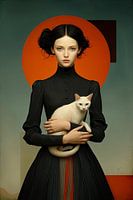 Een mystiek portret waarin een serieuze jonge vrouw in zwarte, sobere kledij een witte kat zacht tegen zich aanhoudt. Omgeven door een intens oranje aureool tegen een rustgevend groen-beige achtergrond, creëert dit werk een hedendaagse religieuze iconografie. De compositie combineert klassieke symmetrie met surrealistisch minimalisme,…