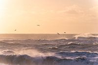 Ervaar de majestueuze kracht van de natuur met deze prachtige foto van grote golven bij Black Beach in IJsland tijdens zonsopkomst. De zachte pastelkleuren van de lucht en de kalme zee creëren een rustgevend beeld, terwijl de indrukwekkende golven op de achtergrond je laten voelen hoe klein we zijn in vergelijking met de ongerepte natuur.