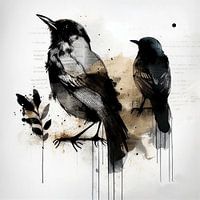 Aquarel van twee zwarte merels met op de achtergrond een tijdschrift. Mixed media. Passend bij diverse trends, zoals Beige & Organic. Zwart, wit en beige geven het een mooi sereen en natuurlijke uitstraling. Er is gebruik gemaakt van natte watertechnieken.