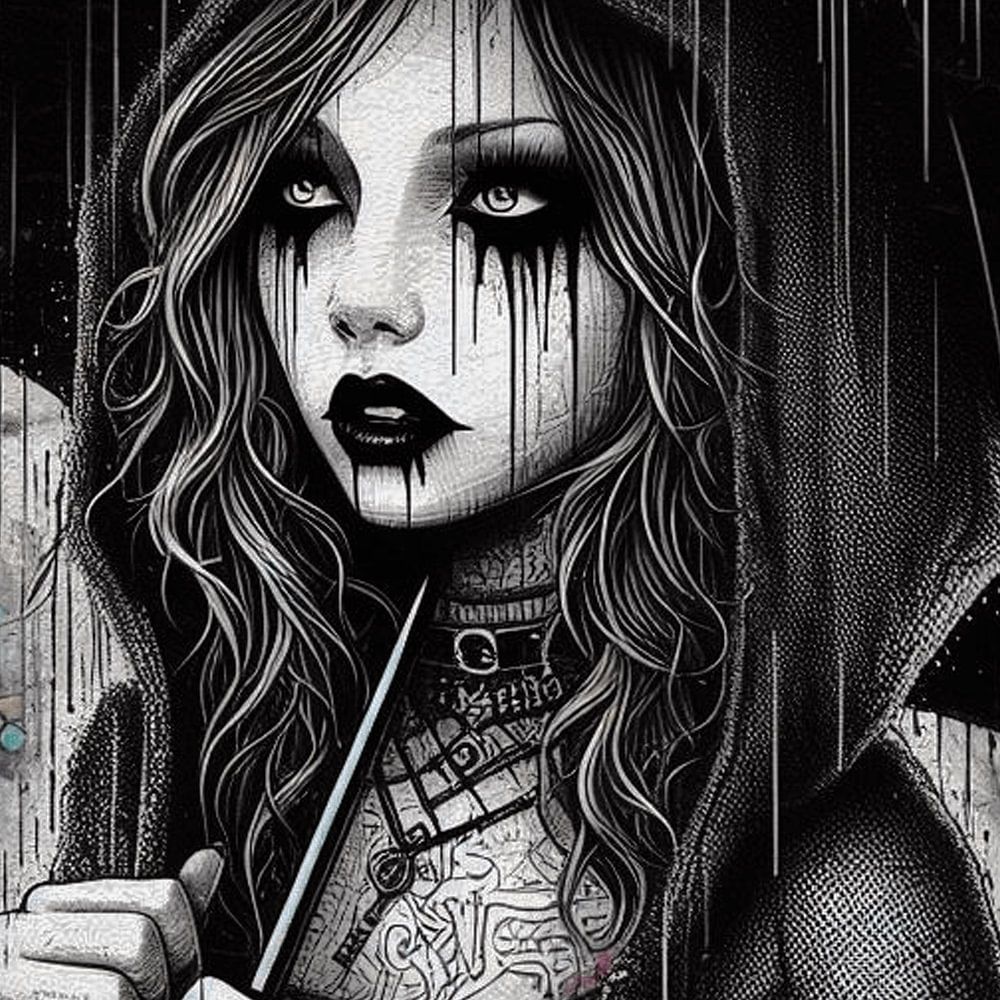 De combinatie van de zwarte paraplu, het meisje en de graffiti line art in gotische stijl roept een gevoel van contrast op tussen duisternis en licht, traditie en rebellie. Het is een visuele weergave van de moderne interpretatie van gotische kunst en cultuur, waarbij elementen uit het verleden worden gecombineerd met hedendaagse…