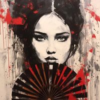 Portret van een vrouw in zwart wit in met rode details, met name in de waaier. Aquarel met druiptechniek. Passend bij diverse stijlen en trends. Japandi.