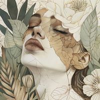 Een vrouwenfiguur tussen bloemenelementen in de stijl van een illustratie.