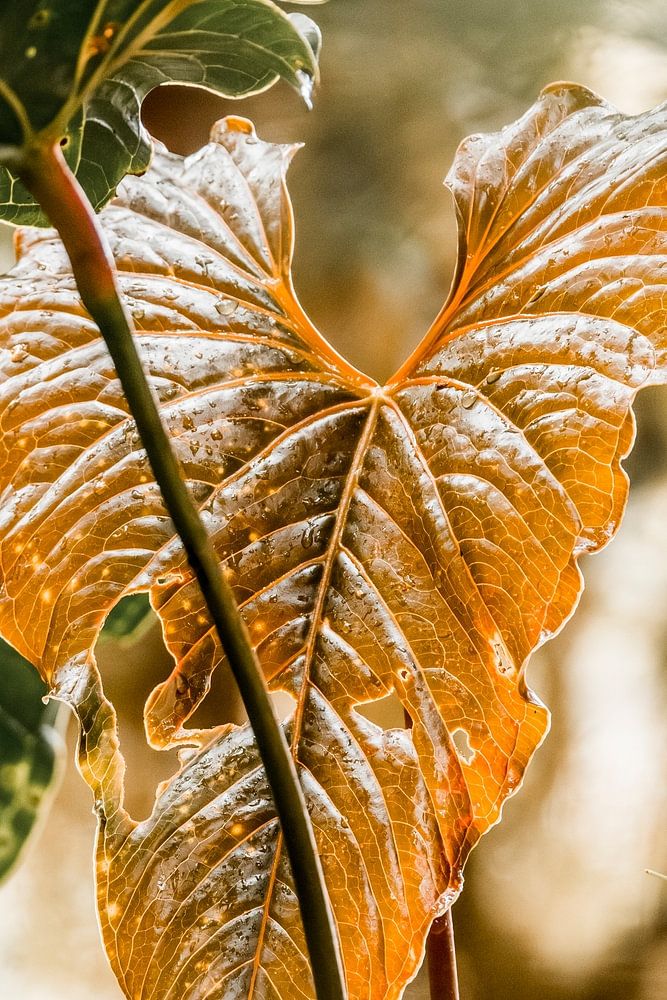 Een hartvormig blad vangt het warme zonlicht in deze intieme botanische close-up, waarbij de oranje gloed en de textuur van nerven prachtig worden geaccentueerd tegen een zachte, wazige achtergrond van groen en mos. Het licht schijnt er subtiel doorheen, waardoor het blad bijna transparant en levendig lijkt. De combinatie van kleur, vorm en licht geeft deze compositie een poëtisch en organisch karakter. Een perfect kunstwerk voor liefhebbers van natuurdetails en tropische elegantie.