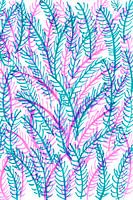 Een patroon van handgetekende bladeren in fel roze en teal. Waar ze overlappen, worden de kleuren donkerder.