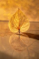 Dit prachtige ontwerp toont een enkel blad, perfect symmetrisch weerspiegeld op een gouden achtergrond. Het natuurlijke element van het blad met zijn ingewikkelde aders staat in mooi contrast met de zachte, diffuse gloed van het gouden licht. Dit stuk straalt rust uit en brengt een stukje natuur in elk interieur. Het gebruik van warme gouden en oranje tinten maakt het ideaal voor een omgeving die zowel modern als uitnodigend wil zijn. Ideaal om een centraal punt in de woon- of eetkamer te creëren en gesprekken te stimuleren.