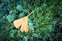 Blad van een ginkgo, Ginkgo biloba, in de herfst op een groene weide in het park