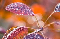 Kleurrijke foto van een blad van een plant waar regendruppels op blijven liggen. De druppels water lijken wel parels die schitteren in de zon. De plant heeft mooie kleuren en de bokeh in de achtergrond maakt deze foto helemaal af.