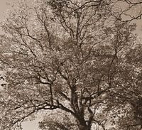 Deze foto toont een majestueuze, oude boom met een indrukwekkend netwerk van takken en bladeren, vastgelegd in een warme sepia-tint. De sepia geeft het beeld een nostalgische sfeer, alsof het een herinnering is uit een ver verleden.