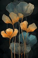 Deze afbeelding kenmerkt zich door transparante bloemen in warme koper- en koele blauwtinten tegen een donkere achtergrond, wat een X-ray effect geeft. Het is een spel van kleur en transparantie dat de delicate schoonheid van de natuur benadrukt. De stijl doet denken aan botanische illustraties, maar met een moderne, bijna technologische twist.