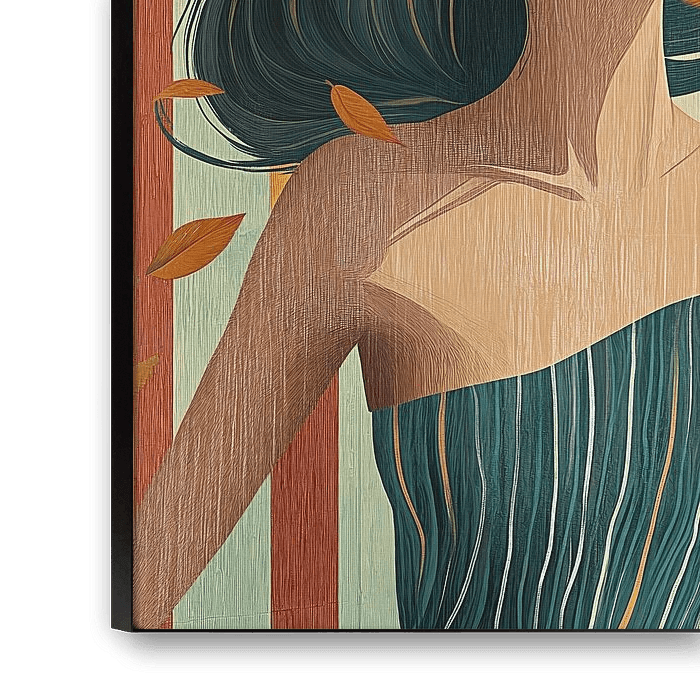 Een surrealistisch digitaal portret van een vrouw die opgaat in de herfst. Haar donkere haar waait mee met de wind en vermengt zich met vallende bladeren in warme herfsttinten. Ze draagt een zonnebril en kijkt omhoog, alsof ze de verandering van het seizoen verwelkomt. De achtergrond bestaat uit verticale strepen in herfstkleuren, die de beweging en energie van de scène versterken. Het beeld roept een gevoel van vrijheid en verbondenheid met de natuur op, waarbij de grens tussen mens en omgeving vervaagt. De illustratie nodigt de kijker uit om de schoonheid en dynamiek van de herfst te ervaren door de ogen van de afgebeelde vrouw.