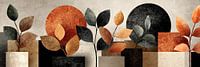 Bladeren Geometrisch - Dit is een botanisch schilderij met bladeren en geometrische vormen in aardetinten, waarbij het contrast tussen de bladeren en de ronde vormen in zwart en oranje een modern en uitnodigend gevoel oproept.