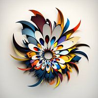 Het schilderij toont een organische compositie van verschillende vormen van plantenbladeren. De bladeren zijn gestileerd en in verschillende maten en kleuren weergegeven, waardoor een levendige en dynamische indruk ontstaat. De verschillende bladvormen lijken met elkaar te versmelten en vormen een harmonieus geheel. De vloeiende lijnen versterken de indruk van natuurlijke beweging en geven het schilderij een zekere lichtheid.