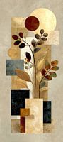 Bladeren Kunst | Earthy Greens and Warm Hues - Dit botanisch schilderij toont een stijlvolle opstelling van bladeren in aardetinten, gecombineerd met geometrische vormen en een grote gouden cirkel die de zon symboliseert, waardoor het een warme en moderne uitstraling heeft die perfect is voor elk interieur.