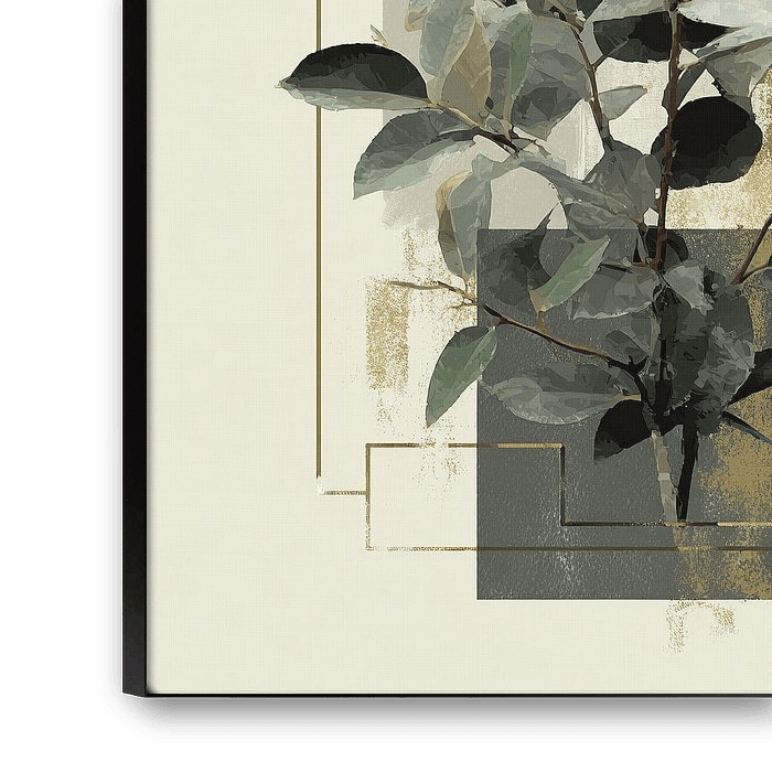 Bladeren Schilderij | Leafy Elegance - Dit botanisch schilderij toont een prachtige tak met bladeren, die uit een minimalistische achtergrond van geometrische vormen en zachte kleuren komt, waardoor het een frisse en moderne uitstraling heeft die perfect past in een eigentijds interieur.