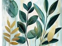 Bladeren | Whispering Green Elegance - Dit bloemen schilderij toont een diversiteit aan gestileerde bladeren in tinten groen en goud, op een zachtgekleurde achtergrond met textuur die rust en natuurlijke schoonheid uitstraalt.