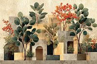 Bladeren en Bloemen - Dit botanisch schilderij toont een speels arrangement van groene bladeren en warme oranje bloemen, tegen een achtergrond van zachte, aardse tinten en geometrische vormen, dat een serene, moderne sfeer oproept in elk interieur.