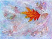 Leaves in the Autumn Wind is een abstract acrylschilderij in portretformaat geschilderd door de kunstenaar Karen Kaspar. De focus van het schilderij is een Amerikaans rood eikenblad in heldere warme herfstkleuren geel, oranje en rood. De achtergrond is geschilderd met losse, bewegende penseelstreken in koelere tinten blauw, wit, paars en roze om de frisse koele herfstwind weer te geven. Afzonderlijke herfstbladeren zijn nog steeds te zien op de achtergrond, maar ze zijn alleen onscherp om de beweging van de dwarrelende bladeren weer te geven. Het schilderij is geschilderd met verschillende lagen verf, zodat de achtergrond er getextureerd en levendig uitziet.