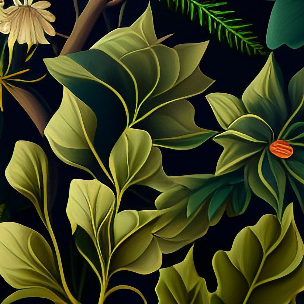 Deze elegante illustratie toont een weelderig arrangement van planten en bloemen in een klassieke Art Nouveau-stijl tegen een diepe, donkergroene achtergrond die doet denken aan de rust van een bos. Het ontwerp maakt geen gebruik van arceringen en kleurovergangen, maar geeft de voorkeur aan krachtige, strakke lijnen en vlakke kleuren voor een geraffineerde uitstraling. De bladeren zijn versierd met subtiele patronen en glinsterende gouden accenten, terwijl feloranje en rode bloemen warmte en levendigheid toevoegen. Verspreid liggend geel fruit voegt charme en evenwicht toe. Aardetinten en gestileerde vormen maken dit stuk tijdloos en uitnodigend - ideaal voor prints, textiel of op de natuur geïnspireerde decoraties.