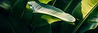 Weelderig groen ontvouwt zich in een mysterieus spel van licht en schaduw. De glanzende, brede bladeren lijken op de zachte golven van een tropische oceaan, die elegant om elkaar heen kronkelen. Verborgen patronen en fijne texturen nodigen je uit om je onder te dompelen in de diepte van de natuurlijke ruimte en de frisse energie van de natuur te voelen.