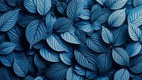 Een dichte compositie van bladeren in verschillende tinten blauw. De gedetailleerde bladstructuren en fijne nerven geven de afbeelding een bijzondere diepte en elegantie. Het monochrome kleurenschema creëert een rustgevend en harmonieus effect dat de natuur op een gestileerde en artistieke manier vastlegt.