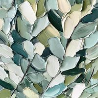 Weelderig spel van bladeren, opgebouwd met dikke, pasteuze verfstreken die een voelbare textuur creëren. De compositie bestaat uit overlappende bladstructuren in tinten van zacht groen, grijsgroen, crème en gebroken wit. Elke penseelstreek benadrukt de organische vormen en voegt een tastbare dimensie toe, alsof de bladeren bijna van het…
