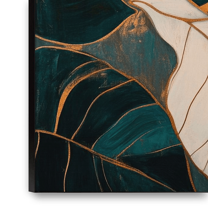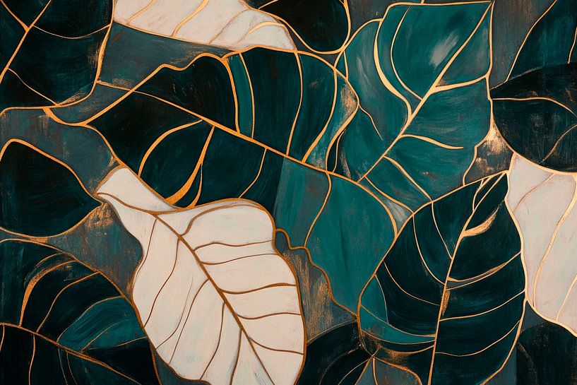 Een jungle van kleurrijke bladeren ontvouwt zich in diepe, smaragdgroene tinten met fijne gouden aderen die er doorheen lopen. De zachte tinten variëren tussen koel en warm, terwijl enkele lichtgekleurde velden verschijnen als kleine eilandjes van licht. Deze compositie roept een gevoel van rust op en tegelijkertijd van levende natuur…