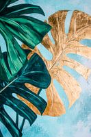 Een harmonieus samenspel van weelderige, groene bladeren en glinsterend goud ontvouwt zich tegen een zachte aquamarijnkleurige achtergrond. De krachtige monsterabladeren lijken samen te smelten in een elegante dans, terwijl het gouden blad een vleugje weelderige luxe toevoegt. Dit kunstwerk straalt tropische frisheid en tijdloze…