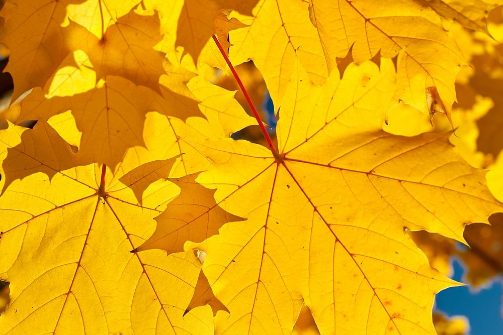 Bladeren van een Noorse esdoorn, Acer platanoides met heldergele herfstkleuren tegen een onbewolkte blauwe hemel, in het Herrenkrugpark in Maagdenburg