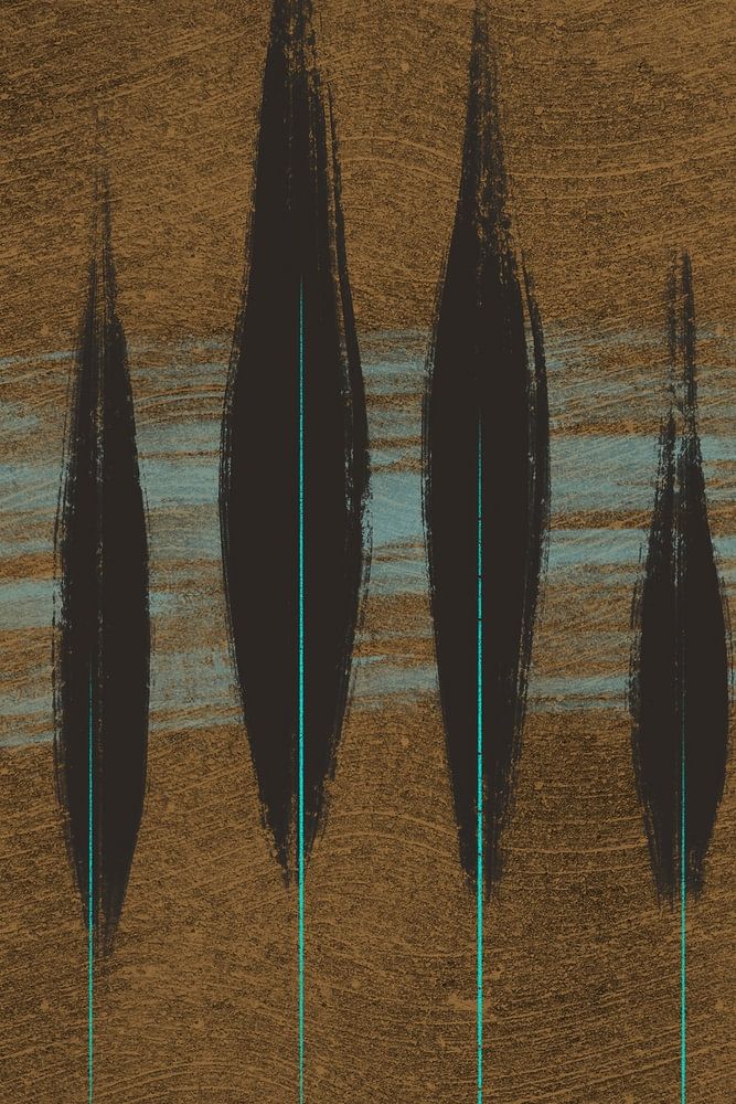 Moderne, abstracte kunst met een ruwe, cementachtige, gouden achtergrond, licht blauwe veeg en veren of bladeren op de voorgrond.