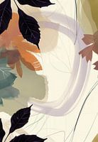Abstracte botanische afbeelding van bladeren, vlakken en lijnen. Complementaire kleurstelling in paars, blauw, terra, bruin, wit, zwart en groen. Passend bij diverse stijlen en trends. Modern abstract. Botanische prent.