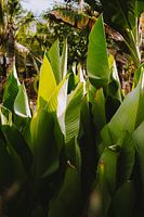 Je ziet een groep grote, felgroene bladeren die dicht op elkaar groeien. Het licht valt er deels op, waardoor sommige stukken helder zijn en andere juist donkerder. Op de achtergrond staat meer tropisch groen. Het voelt alsof je heel dichtbij staat, midden tussen de planten.