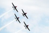 Het Engelse Blades aerobatic team vliegt een diamant formatie met rook tijdens hun show met hun Extra Flugzeugbau EA300 aerobatic monoplane.