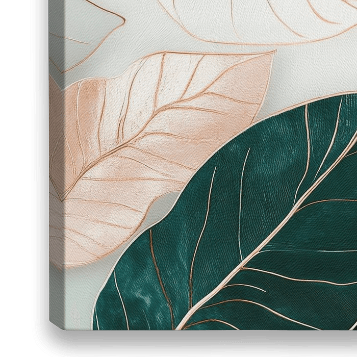 Een harmonieus samenspel van weelderig groen en zachte pastelkleuren omlijst het landschap. De tere, glanzende bladeren lijken te fluisteren, terwijl fijne gouden streken hun contouren accentueren. Deze botanische compositie ziet eruit als een uitnodigende tuin die de kijker uitnodigt om te blijven hangen. Er hangt een gevoel van rust…