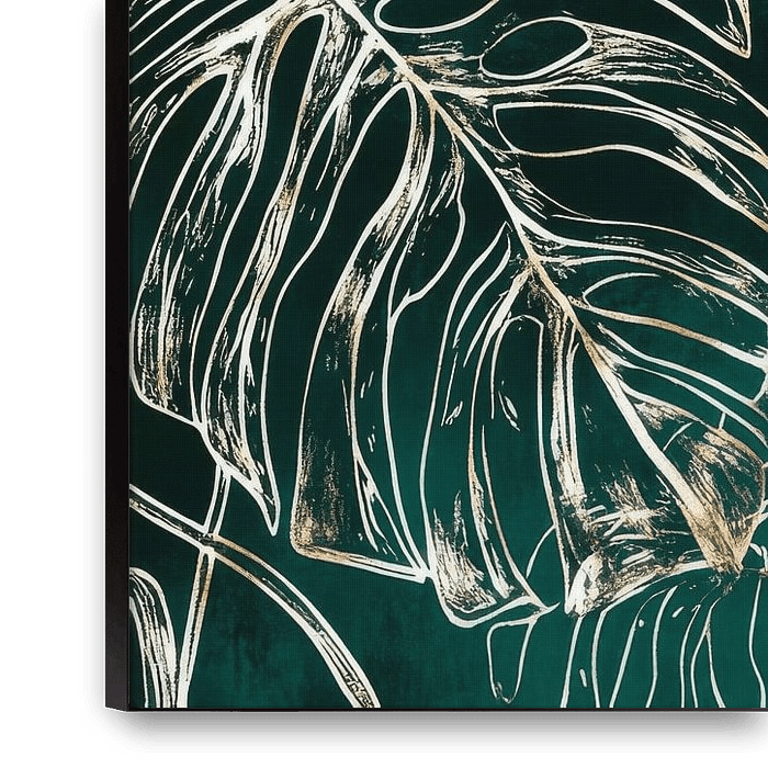 Weelderige monsterabladeren ontvouwen zich in een harmonieus samenspel van diepgroene en zachte grijstinten. Hun delicate, gouden patroon vangt het licht en verleent de compositie een luxueuze glamour. Deze botanische elegantie nodigt je uit om je onder te dompelen in een wereld van exotisme en stijl.