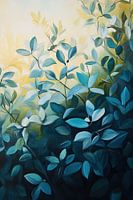 Bladkleur - Dit plant schilderij toont een levendig tableau van bladeren met een kleurverloop van donkerblauw in de onderhoek naar lichtgeel en wit aan de bovenkant, waardoor een indruk van licht en schaduw wordt gecreëerd in een botanische setting.