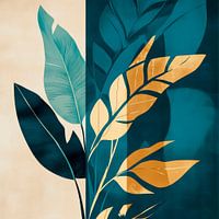 Een harmonieus samenspel van koele en warme tinten ontvouwt zich in deze gestileerde plantenwereld. Elegant gebogen bladeren dansen in contrast tussen weelderig groen en gouden accenten die spelen met licht en schaduw. Deze compositie straalt een tijdloze elegantie uit en geeft de indruk dat de natuur zelf een artistieke dialoog voert.