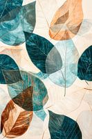 Een harmonieus samenspel van zachte kleuren en delicate bladeren ontvouwt zich op een helder oppervlak. De heldere transparantie van de bladeren, in verschillende tinten blauw, groen en aardetinten, wekt een indruk van lichtheid en nabijheid tot de natuur. Deze artistieke compositie straalt rust uit en nodigt uit tot dromen.