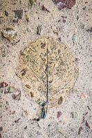 Uitgedroogd bladskelet op een zandkleurig bospad. Geraamte is zichtbaar, maar kleur is vervaagd.