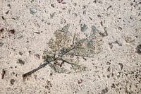 Uitgedroogd bladskelet op een zandkleurig bospad. Geraamte is zichtbaar, maar kleur is vervaagd.