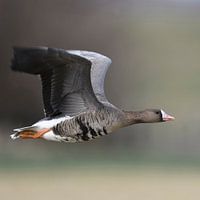 Blaessgans / White-fronted Goose ( Anser albifrons ), in fast flight, close by, in typical rural surrounding of their winter territory, side view, wildlife, Europe.