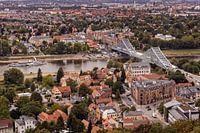 Panorama over de Elbe met een stoomboot die de Blaue Brücke nadert.