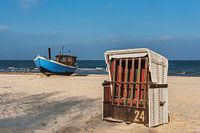 Blaues Fischerboot an der Ostsee in der Nähe der Seebrücke Heringsdorf, im Vordergrund befindet sich ein Strandkorb, Gemeinde Heringsdorf, Insel Usedom, Landkreis Vorpommern-Greifswald, Mecklenburg-Vorpommern, Deutschland, Europa
