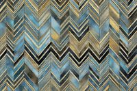 Dit werk toont een herhalend chevronpatroon in verschillende tinten blauw, goud en beige. De zigzagvormen wisselen elkaar af, waardoor een gevoel van beweging en dynamiek ontstaat. De kleurvariaties en subtiele texturen voegen diepte en complexiteit toe aan het ontwerp.