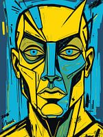 Een opvallend abstract portret met een maskerachtige uitstraling, met een combinatie van blauwe en gele kleuren.