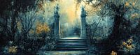 Blauw Geheim - Dit landschapsschilderij toont een mysterieuze, donkerblauwe bosscene verlicht door gouden lichtaccenten, met centraal een klassieke stenen trap geflankeerd door statige beelden op zuilen, wat een gevoel van verwondering en oudheid oproept.